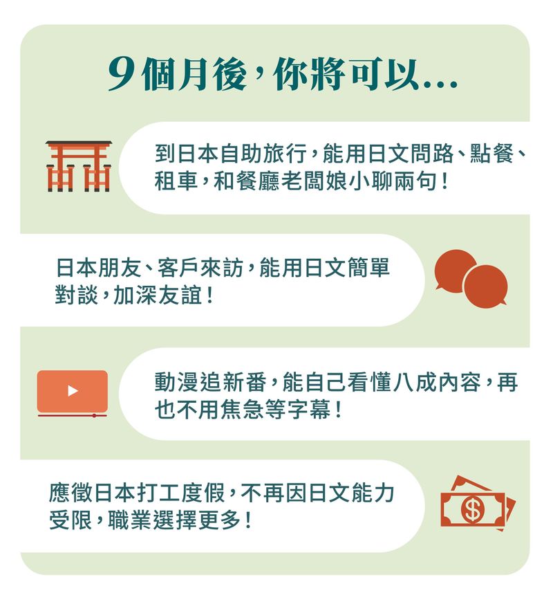 台日雙師資聯合授課,獨家兩階段學習法幫助你九個月從零基礎到能聽能說 N3 程度!