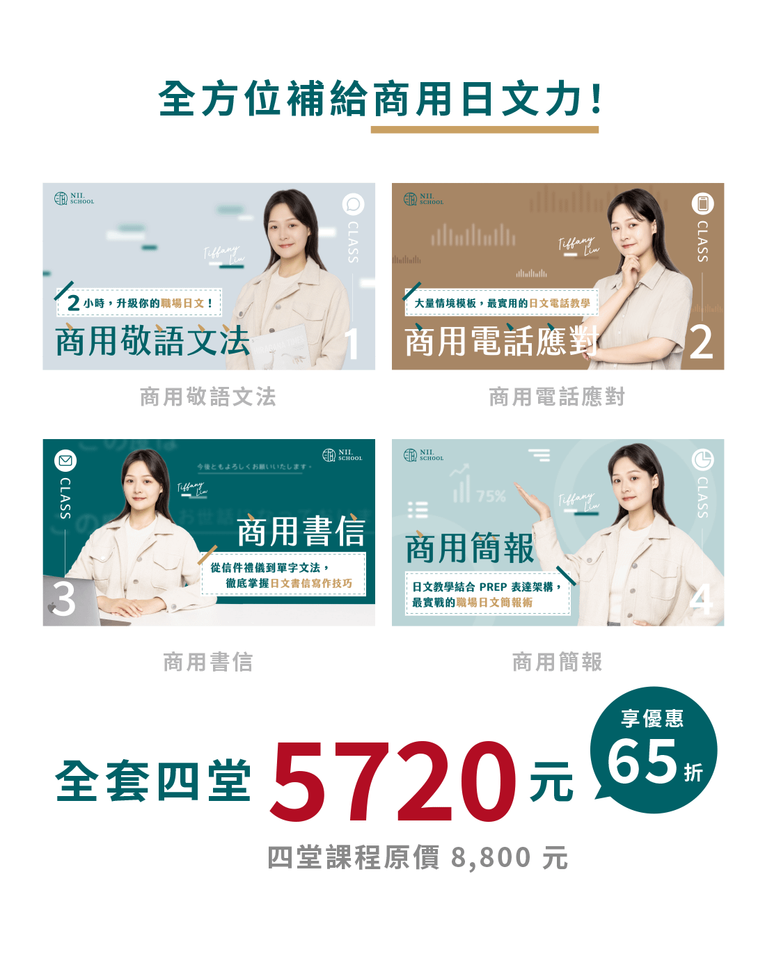 全方位補給商用日文力!《職場日文術》全套四堂課程合購方案,現享 65 折優惠!點擊合購報名頁面即可享全套折扣唷!《點我去四堂合購優惠報名頁面》