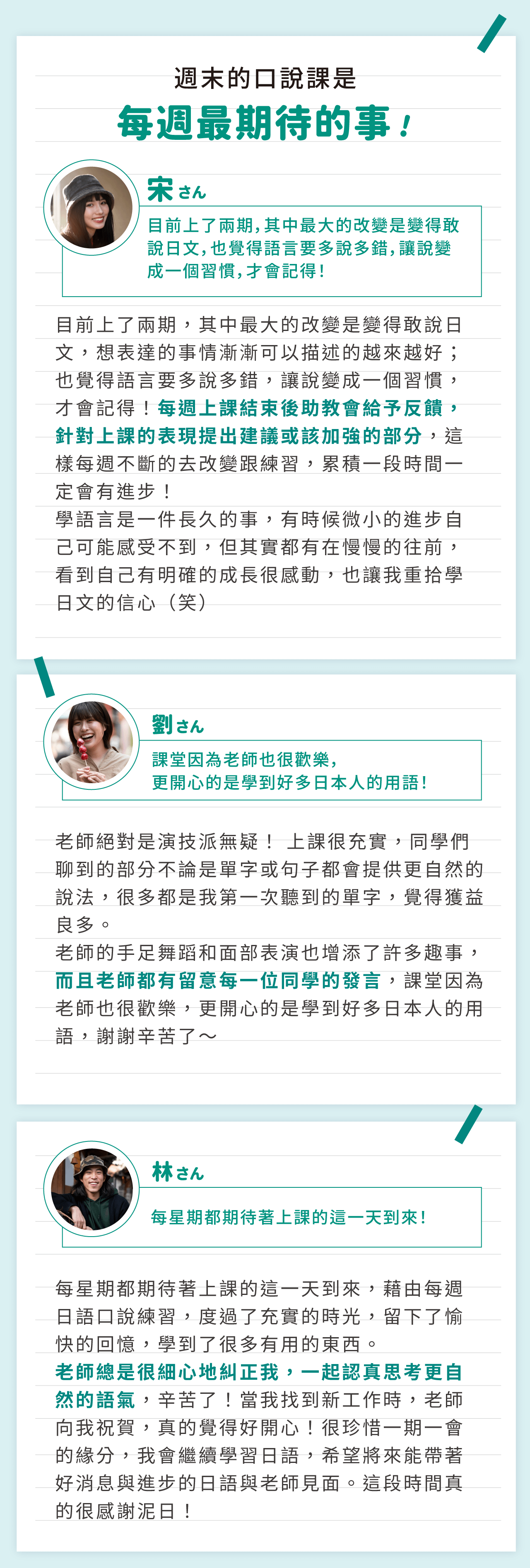因為你使用的詞語不一樣,助教給的回饋跟著不同,在這個主題上你學到的表現方式又更全面了!所以泥日的全日文口說讀書會每年會重複出現一樣的主題,讓你能在同一個主題上將自己的表現方式一次一次調整得更好。
