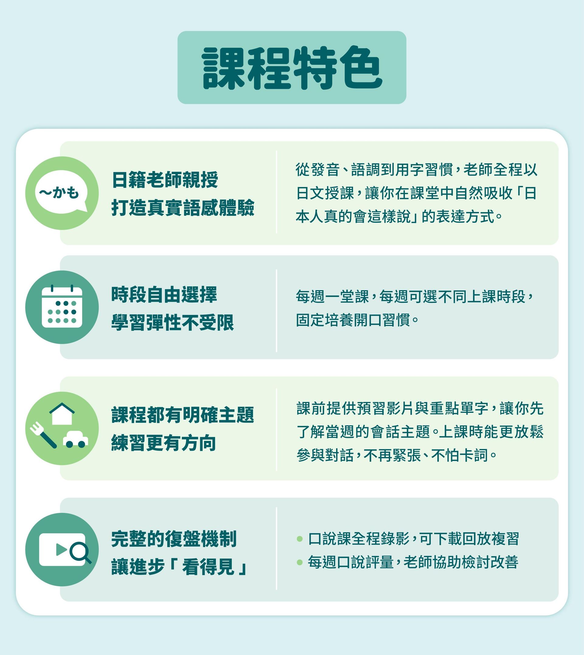 老師也將針對同學的弱項給予專業輔導,學習效率更高,日文會話提升速度更快。