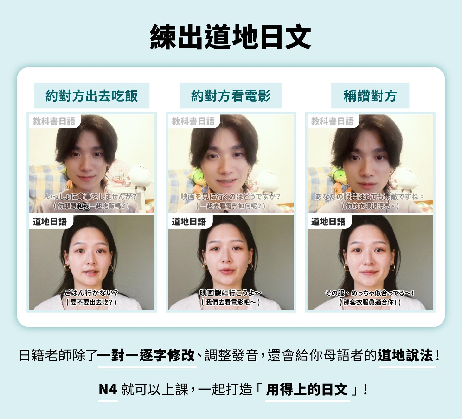 建議學員的日文程度至少在N4以上(熟悉動詞變化、て型句型的概念),再來報名效果會更好喔。